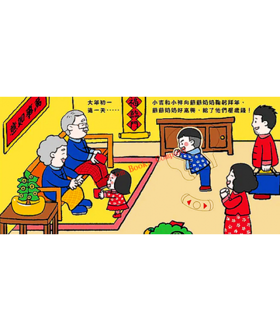 到了過年,小吉和小祥跟著爸爸媽媽四處拜年,親朋好友歡聚在一起互相道賀,
