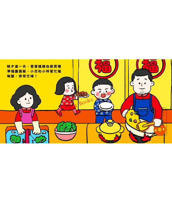除夕這一天,小吉和小祥幫忙爸爸媽媽準備團圓飯,還跟著爺爺奶奶一起包水餃,